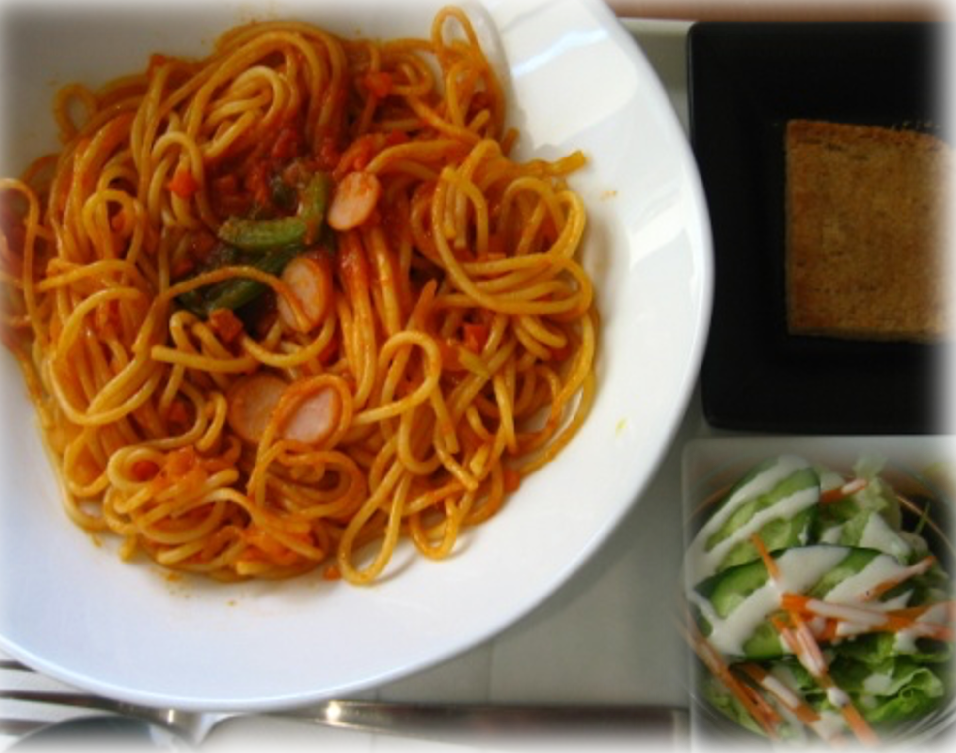 昔ながらのナポリタン。サラダ、ガーリックトースト付き。